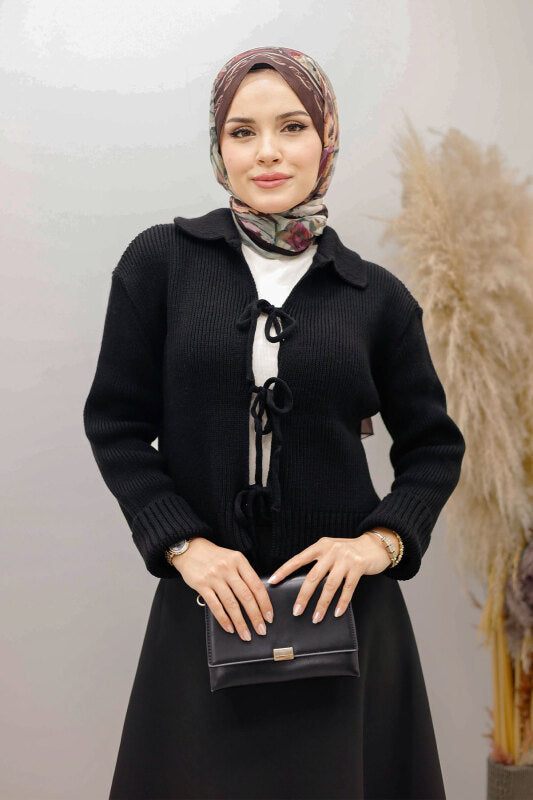 Strickjacke kurz mit Strickmuster und Knöpfen / Schwarz