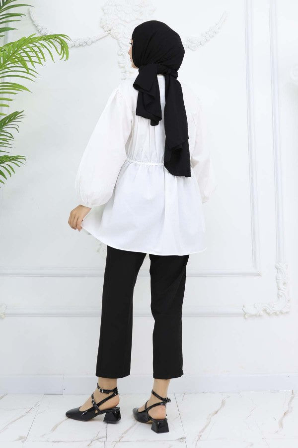 Diese Bluse mit zwei Gummizügen und Steinknöpfen bietet durch ihre normale Passform hohen Tragekomfort und ist in Ihrer üblichen Größe erhältlich. Hergestellt aus 60 % Baumwolle und 40 % Polyester, kombiniert sie natürliche Atmungsaktivität mit langlebiger Formstabilität. Mit einer Länge von 76 cm, einem Brustumfang von 102 cm und einer Taillenweite von 96 cm passt sie ideal für einen vielfältigen Figurtyp. Bitte beachten Sie, dass leichte Farbabweichungen durch das Konzept-Shooting möglich sind. Das auf den Fotos abgebildete Model trägt Standardgröße bei einer Körpergröße von 166 cm.