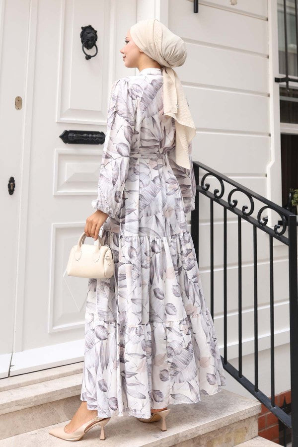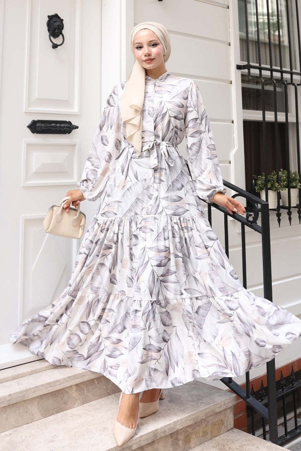 Kleid mit Muster, Volantrock, Gürtel / Beige