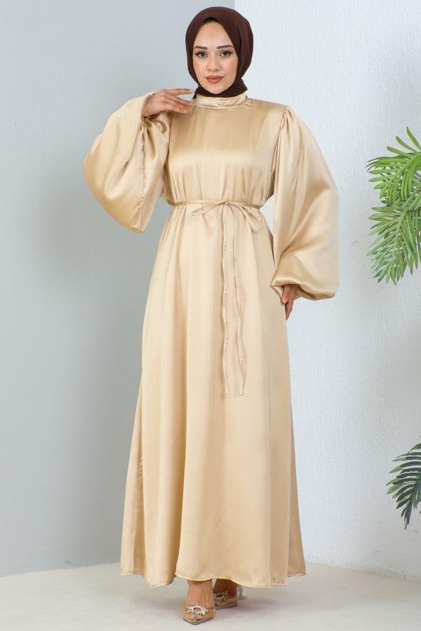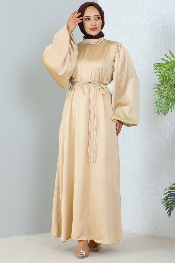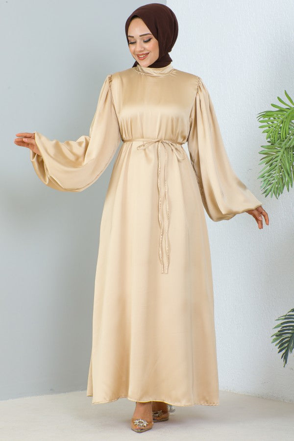 Satinkleid mit Ballonarm und Gürtel